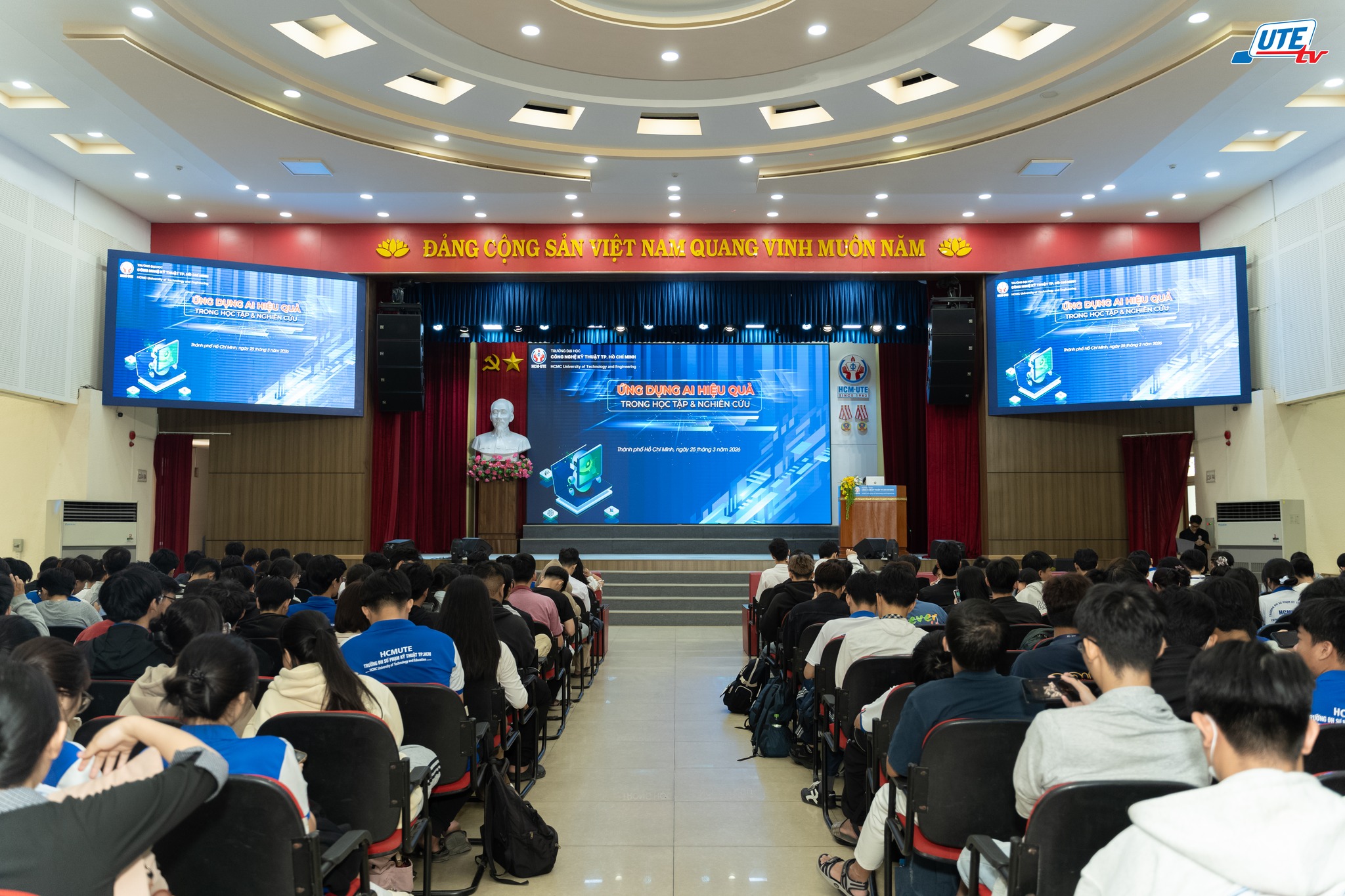 Sáng ngày 25/03/2026, tại Hội trường lớn khu A, Trường Đại học Công nghệ Kỹ thuật TP.HCM (HCM-UTE), tiền thân là Trường Đại học Sư phạm Kỹ thuật TP.HCM, đã tổ chức chương trình tập huấn “Ứng dụng AI hiệu quả trong học tập và nghiên cứu”. Chương trình nhằm phổ cập kiến thức về trí tuệ nhân tạo (AI), đồng thời định hướng sinh viên ứng dụng hiệu quả các công cụ AI trong học tập và nghiên cứu khoa học.