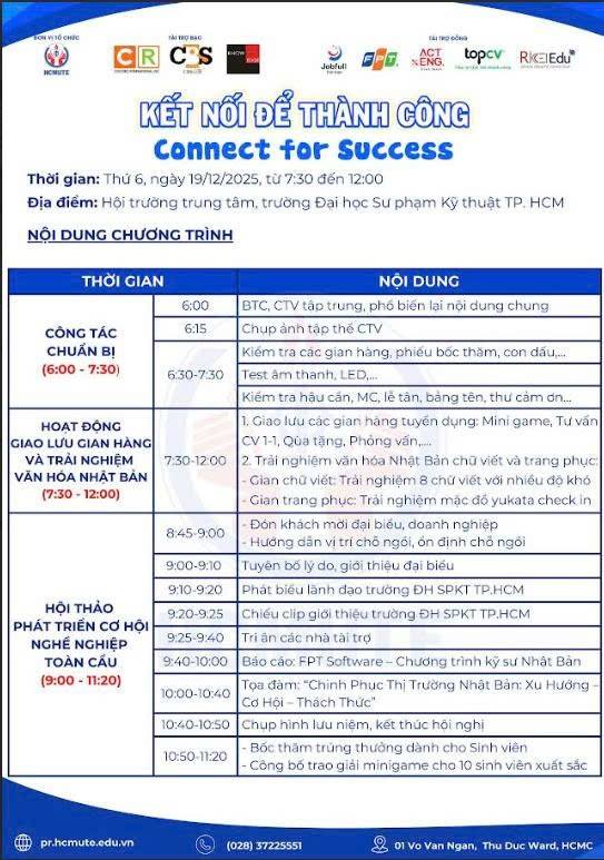 🍀 "Kết nối để thành công" là chương trình được tổ chức với mục đích tạo không gian cho các bạn sinh viên có cơ hội được tìm hiểu, tiếp cận các doanh nghiệp tuyển dụng việc làm ngoài nước (như Hàn Quốc, Nhật Bản, Đức, Úc, ...), định hướng việc làm phù hợp và được ứng tuyển - phỏng vấn trực tiếp.